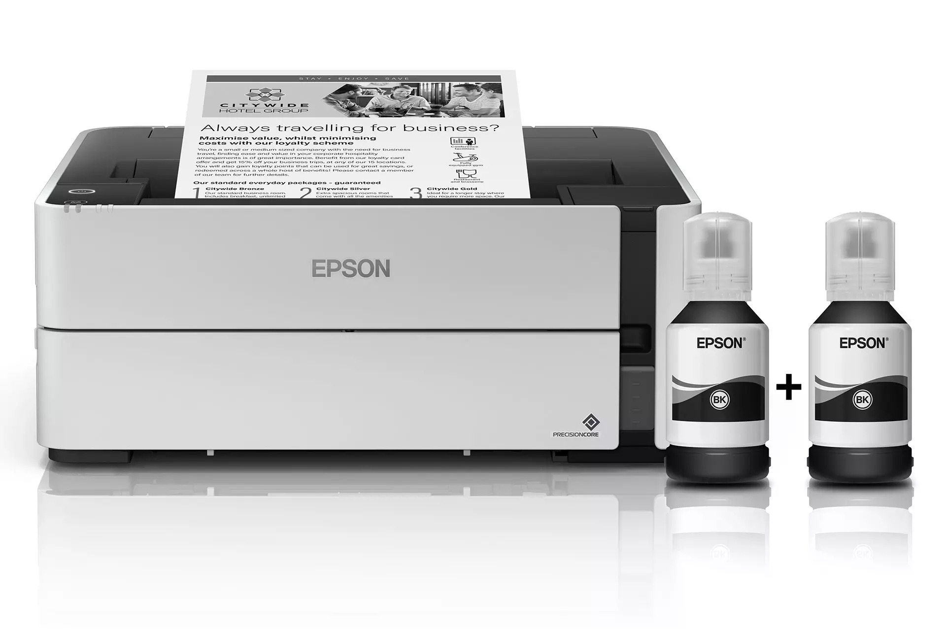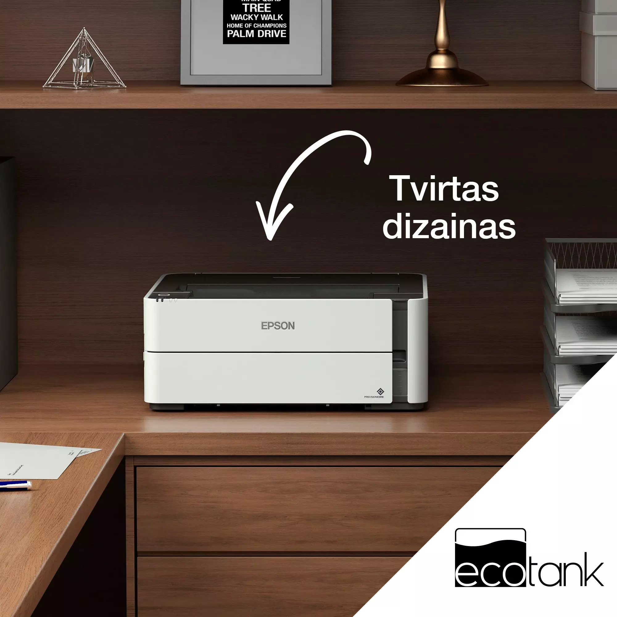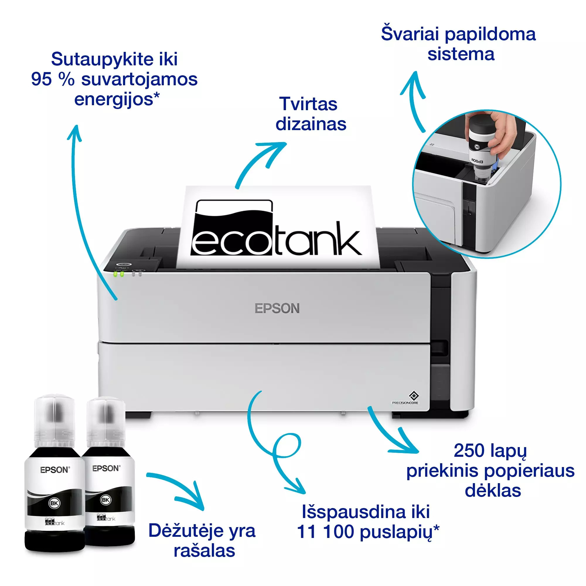 Epson EcoTank M1170 is a monochrome printer with a refillable ink tank that significantly reduces printing costs. With the included black ink, you can print up to 11,000 pages, making it perfect for large volumes of documents. The printer supports Wi-Fi, mobile printing, automatic duplex printing and has a 250-sheet tray. The PrecisionCore print head and Heat-Free technology ensure fast work without warm-up time and efficient energy use.